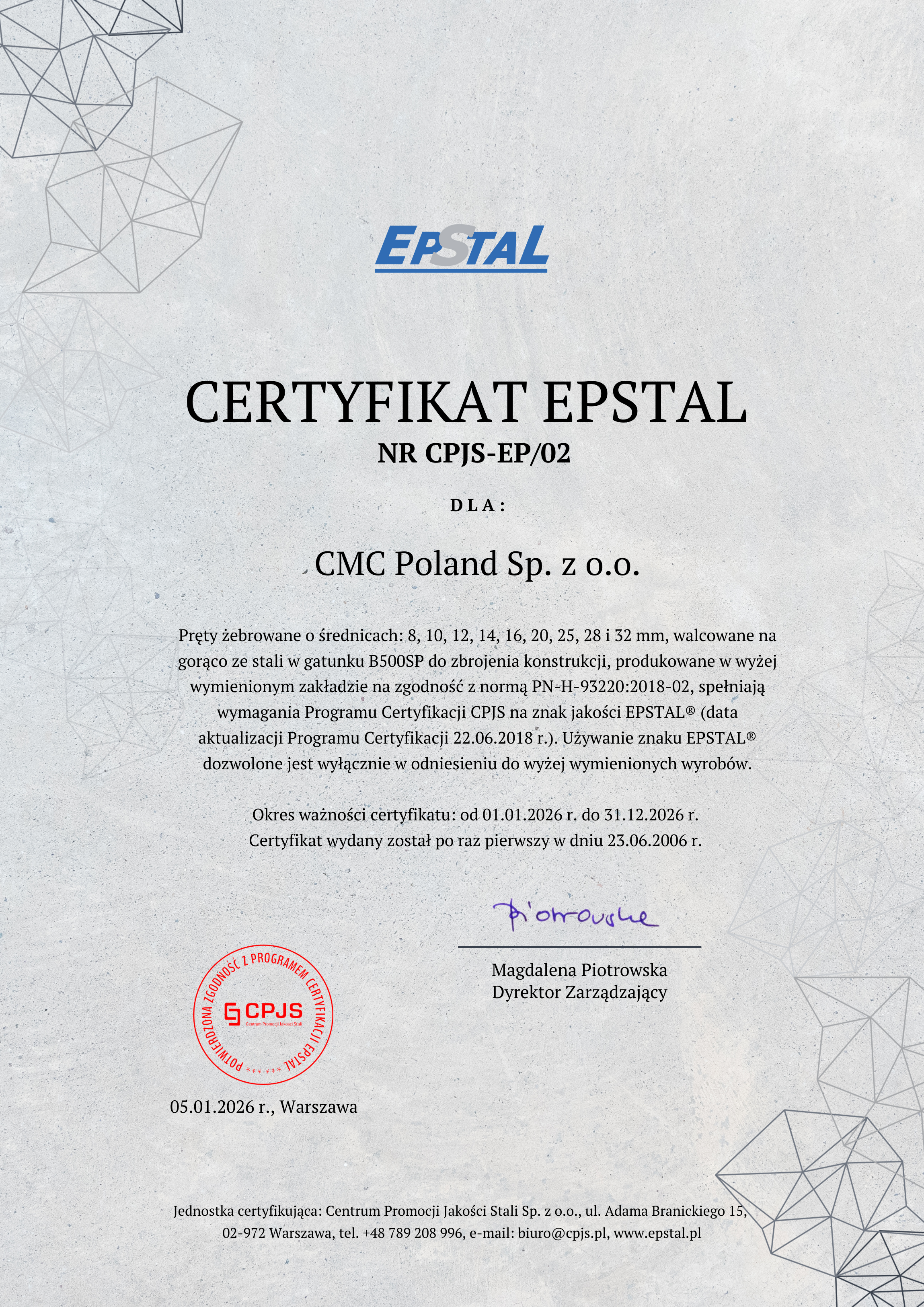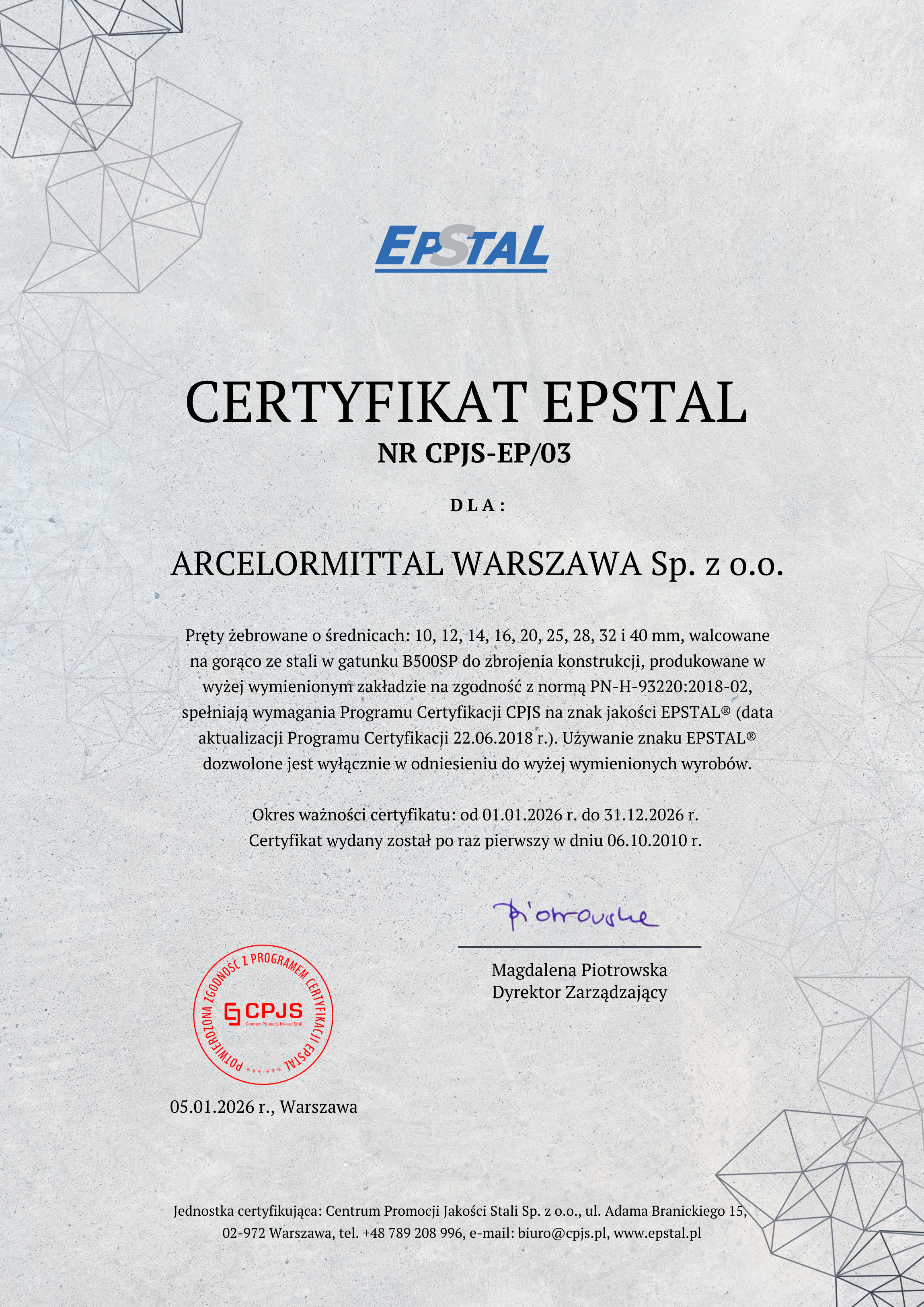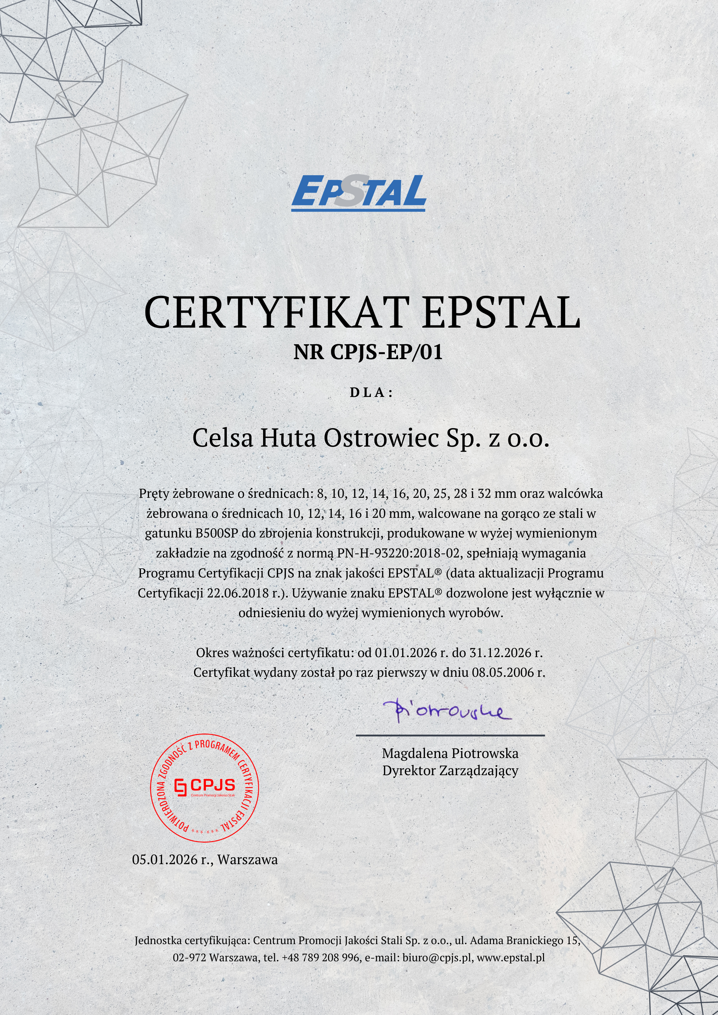 Certyfikat EPSTAL